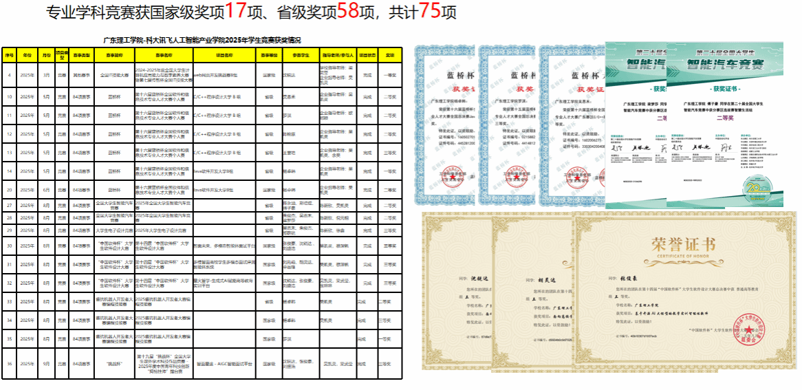 坚持以赛促学,激发创新,协同指导员工参加竞赛,将竞赛内容与专业课程、实践教学相结合,形成“学-练-赛”一体化培养路径。合作至今累计员工获得国家级、省级学科竞赛奖项75个,发表软著、专利、论文31件。其中一支合作员工队伍第十九届“挑战杯”全国老员工课外学术科技作品竞赛2025年度“揭榜挂帅”“人工智能领域”主擂台赛获得国家三等奖。同样另有一支合作员工队伍第十九届全国老员工智能汽车竞赛中获全国总决赛讯飞创意组二等奖。
