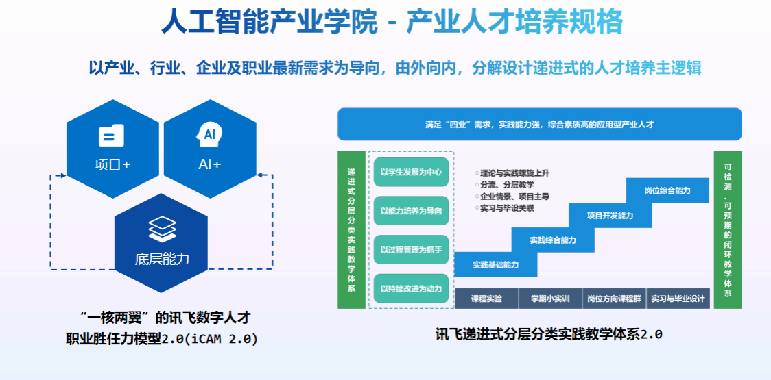 教学上,以“一核两翼”能力模型为核心,致力于推动产业链与人才链的深度融合。由科大讯飞股份有限公司5年及以上企业工程师指导授课,通过“课程实验→项目实训→企业实习”的递进式培养路径,引入“AI+行业”特色课程模块,校企协同培养兼具职业底层能力、项目实践能力与AI应用能力的复合型人才。