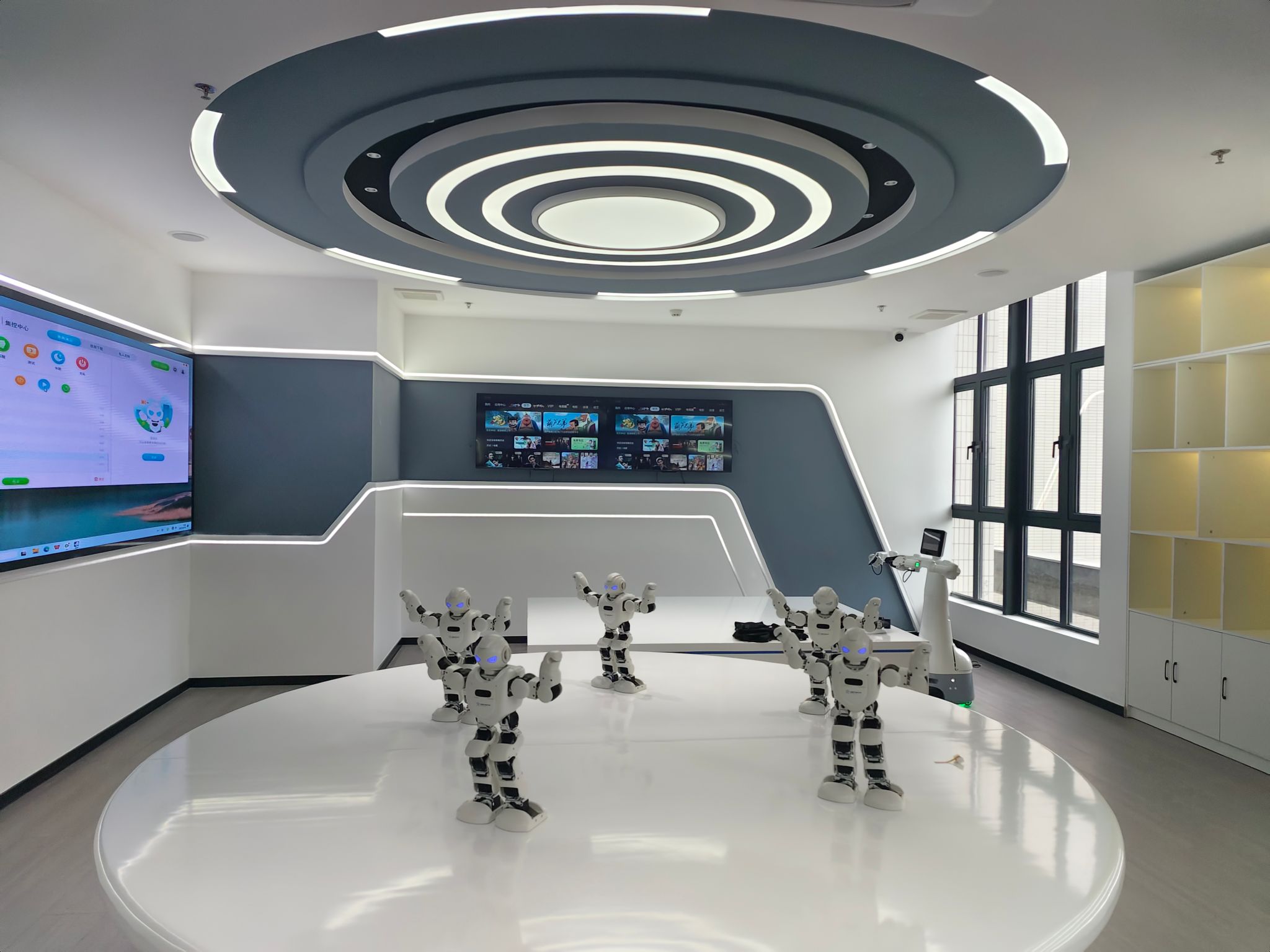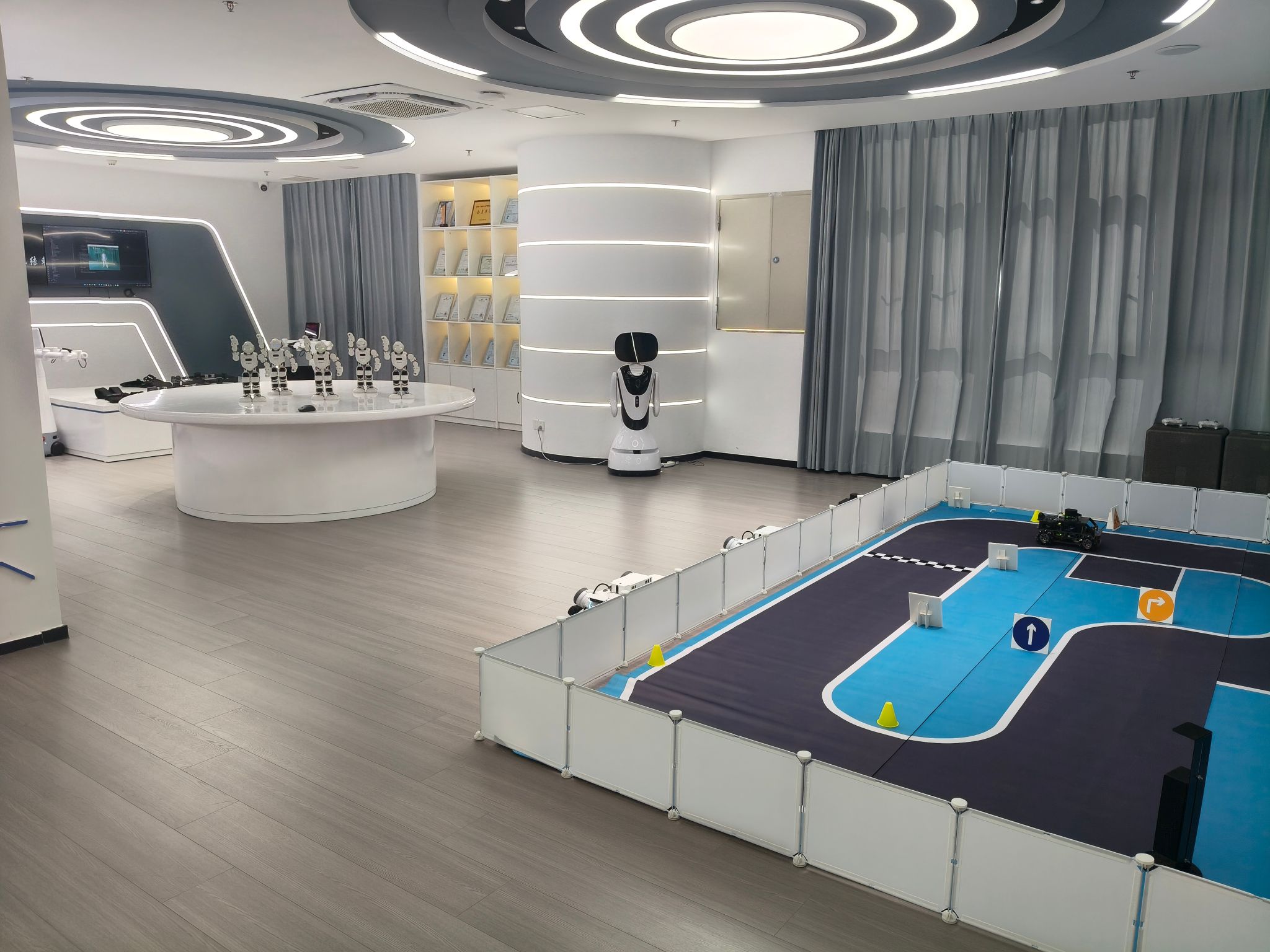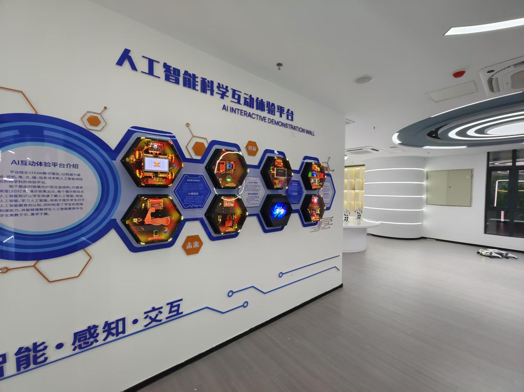 人工智能展厅位于求实楼303,是公司建设的人工智能前沿技术展示、科普教育和实践体验的重要平台,以人工智能技术为核心,全面展示了人工智能在不同领域的创新成果和实际应用。展厅主要有智能讲解机器人、智能人形机器人、智能四足机器狗、人工智能互动体验套件、轮式人形机器人、自动驾驶综合实训套件等设备,支撑公司相关专业的课程实践与师生的课题研究,同时也打造了沉浸式的AI互动体验环境,参观者可以亲身体验人工智能技术及其应用场景,激发其对人工智能技术的兴趣和探索精神。