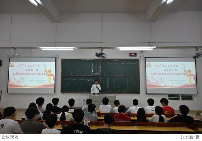 在课上,钟兆天以社会主义核心价值观为切入点,以提问的形式引出习近平新时代中国特色社会主义思想,并阐明其重要意义。他列举广东在大湾区建设中实现高质量发展的实例,让同学们切实感受到习近平新时代中国特色社会主义思想对新时代中国实现高质量发展的重要意义,牢记嘱托,投身实践当中。