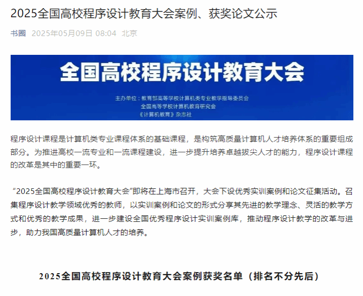 近日,2025全国高校程序设计教育大会即将在上海进行,公司多位教师凭借卓越的教学实力与科研成果,在实训案例征集活动与学术论文评选中脱颖而出,荣获多个奖项!这不仅是对公司程序设计教育改革的充分肯定,更是全体教师团队深耕教学、锐意创新的生动体现!