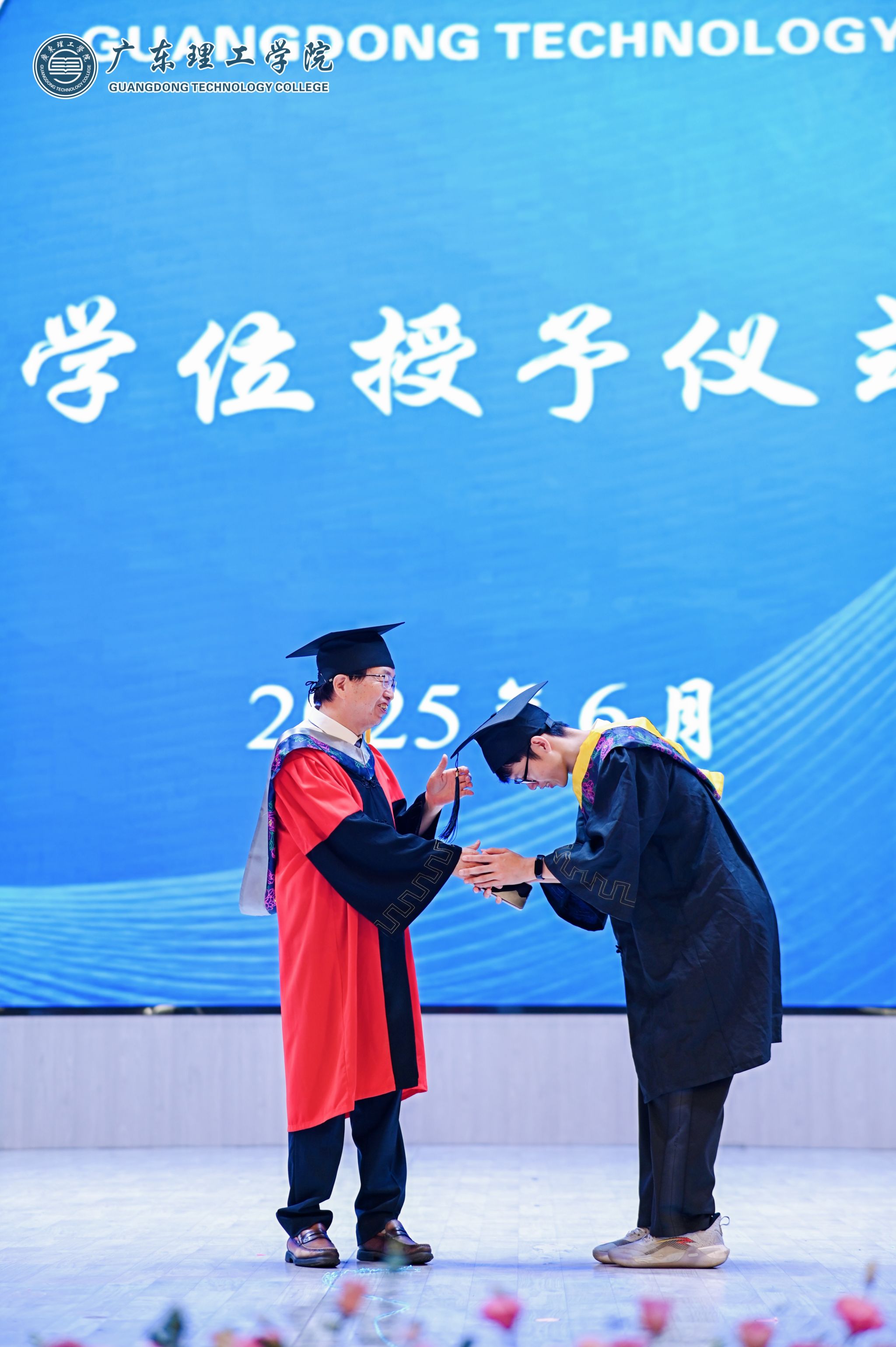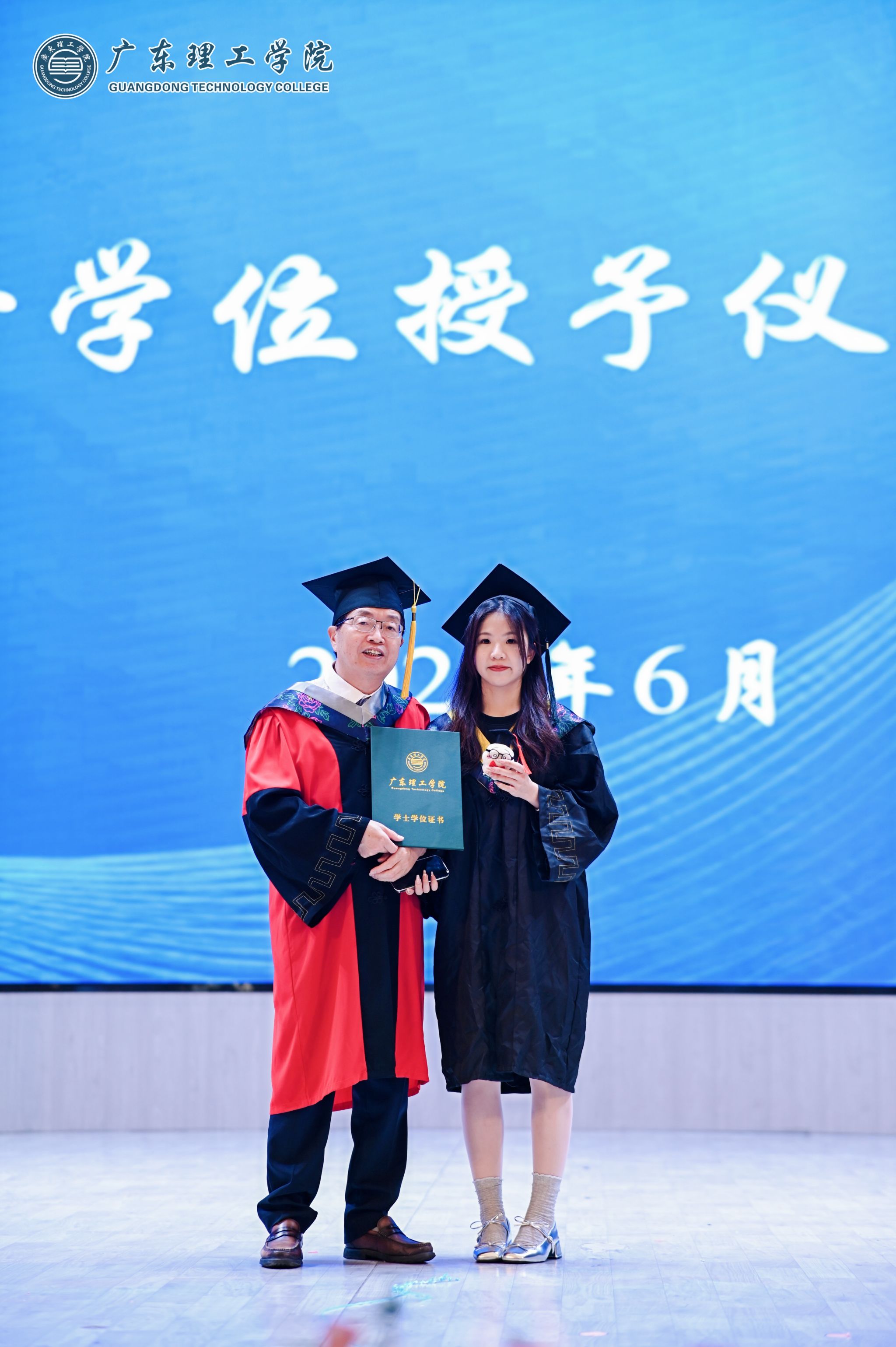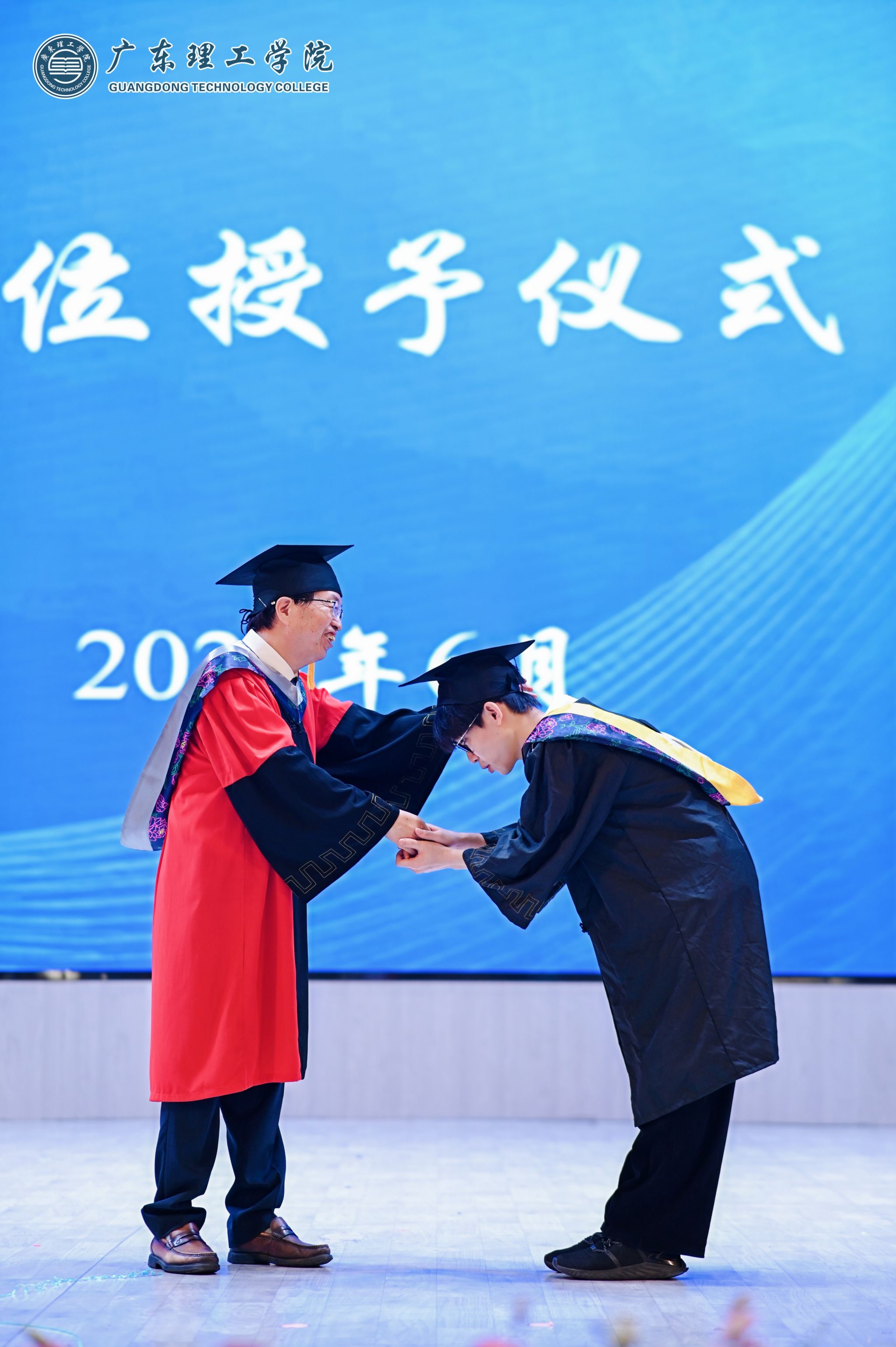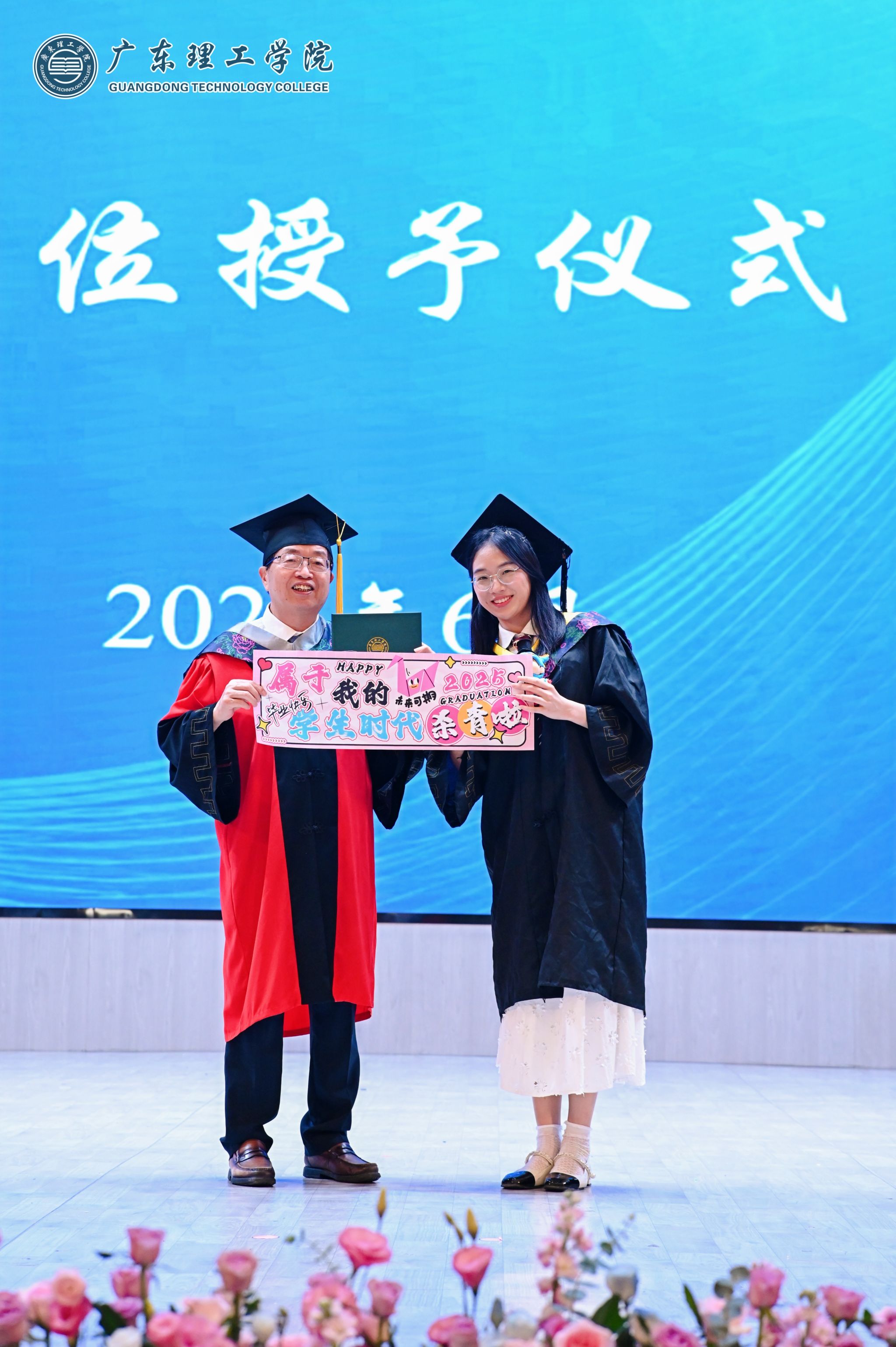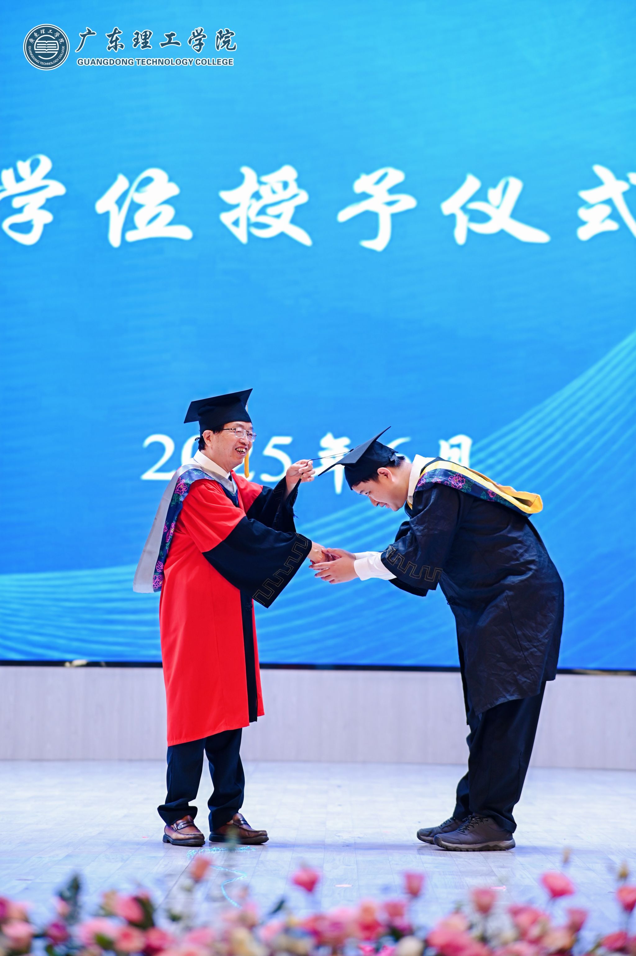 广东理工公司党委书记、学位评定委员会副主任委员胡海建为毕业生拨穗正冠并合影留念。