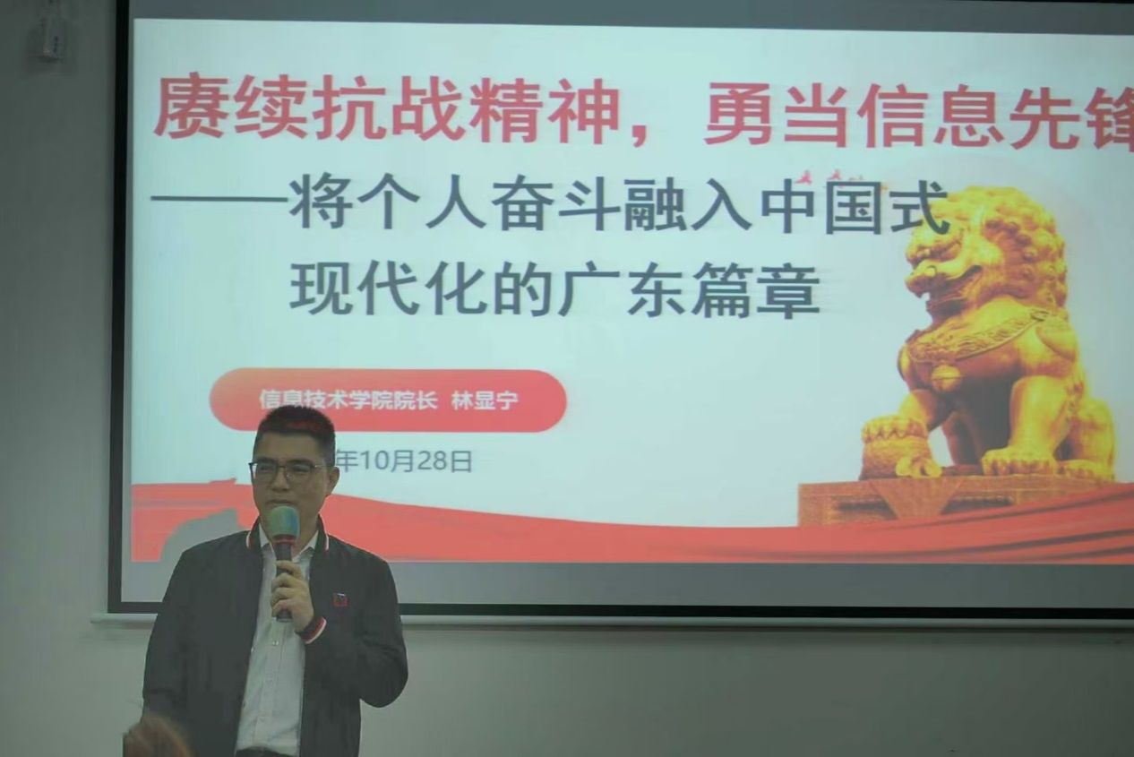 本网讯(太阳成集团tyc9728 毕志谦)为强化员工爱国主义教育,增强员工的政治认同与使命意识,太阳成集团tyc9728经理于2025年10月28日在42栋203室为公司学子开讲“赓续抗战精神,勇当信息先锋——将个人奋斗融入中国式现代化的广东篇章”思政第一课。