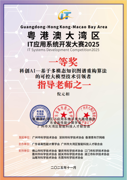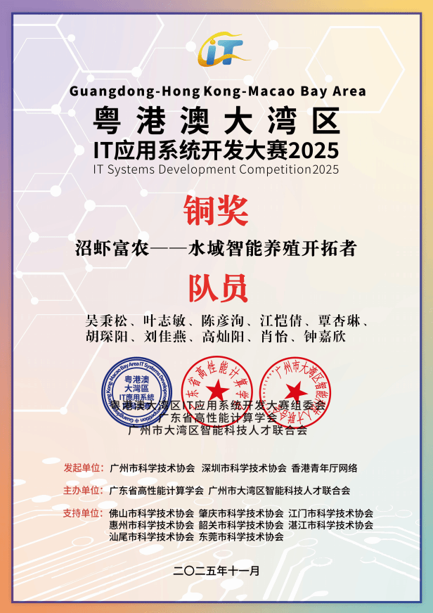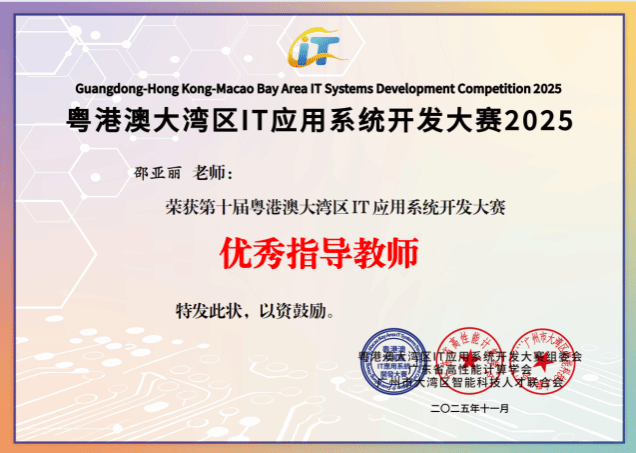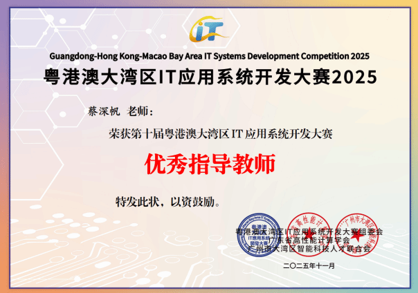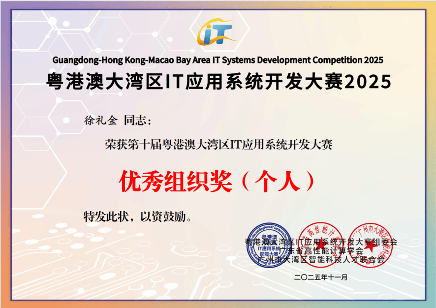 深耕IT创新沃土,勇夺湾区赛事荣光!11月22日,由广州市科协、深圳市科协、香港青年IT网络联合发起,广东省高性能计算学会、广州市大湾区智能科技人才联合会共同主办的“第十届粤港澳大湾区IT应用系统开发大赛总决赛暨颁奖典礼”在广州市南沙区创享湾圆满落幕。作为大赛十周年里程碑赛事,本次活动吸引18个城市近60所高校、11家企业的1500余人报名参赛,提交322个优质项目。公司不仅成功承办肇庆赛区决赛,更在总决赛中大放异彩,公司学子一举斩获特等奖(铜奖)、一等奖、二等奖及多项专项荣誉,公司获评“优秀组织奖”,同时公司多名教师荣获“优秀指导教师奖”,师生团队以硬核实力在大湾区科技竞技舞台上彰显了广理风采。
