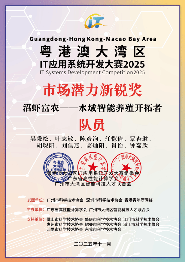 其中,参赛作品《沼虾富农——水域智能养殖开拓者》一举斩获特等奖(铜奖)及“市场潜力新锐奖”。并且,参赛作品《科创AI——基于多模态知识图谱重构算法的可控大模型技术引领者》成功拿下一等奖及“可持续发展贡献奖”双项荣誉。与此同时,参赛作品《稻卫者——基于改进YOLOv10的稻瘟病智能监测机器人》荣获大赛二等奖。