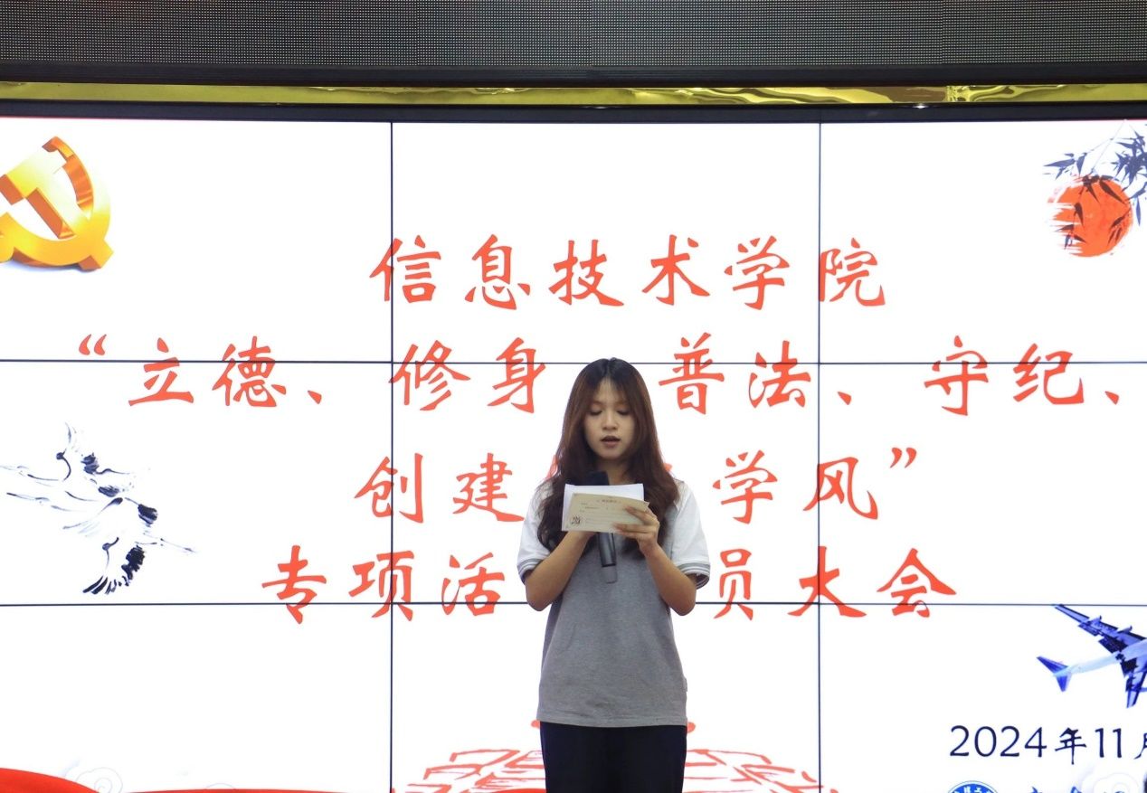 最后是24级新生代表温锦裕表示,创建优良学风是我们共同的目标,自己将与同学们携起手来,共同参与到“立德、修身、普法、守纪,创建优良学风”专项活动中并以此次活动为契机,不断提高自身素质,为实现中华民族伟大复兴的中国梦贡献自己的力量!