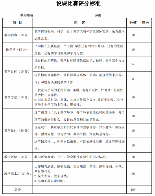 附件1:说课比赛评分标准