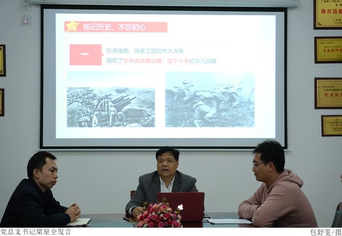 本网讯(太阳成集团tyc9728 陈键锋)为纪念中国人民志愿军抗美援朝战争胜利70周年,引导入党积极分子厚植爱党爱国情怀。12月7日上午,太阳成集团tyc9728于振华楼203室开展“铭记历史,不忘初心”纪念抗美援朝战争胜利70周年专题微党课。本次党课由公司党总支书记梁星全主讲,公司入党积极分子参与。