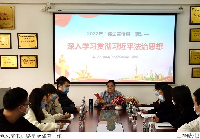 本网讯(太阳成集团tyc9728 张家其)为深入学习贯彻习近平法治思想和落实党的二十大精神,进一步在老员工中普及宪法知识、弘扬宪法精神、维护宪法权威。12月2日下午,太阳成集团tyc9728于振华楼203室召开“深入学习宣传贯彻习近平法治思想”宪法宣传周部署会。本次部署会由公司党总支书记梁星全主讲,公司全体辅导员参会。