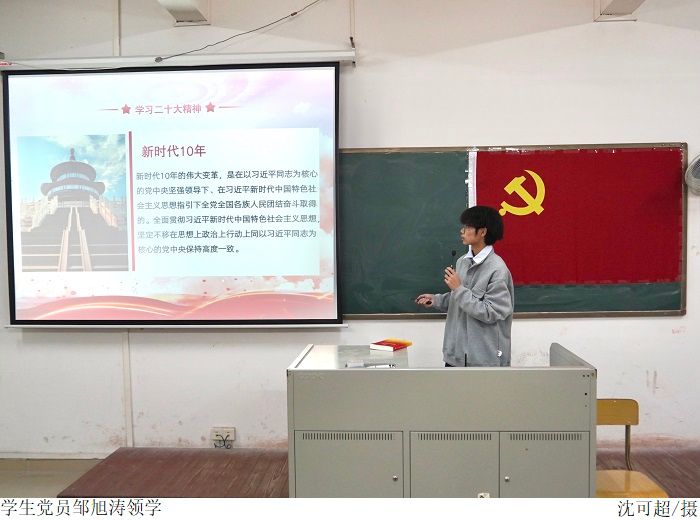 在会议上,员工党员邹旭涛带领与会人员一同学习了党的二十大报告,深刻领会了过去5年的工作和新时代10年的伟大变革,深入学习了党的二十大精神内涵,领悟了新时代新征程中国共产党的使命任务。员工党员汤玉婷引领全体与会人员学习宪法知识,并指出作为新时代青年,同学们应不断加强法治学习,尊崇宪法,敬畏法律,培养依法行权、依法行权的法治思维,自觉维护宪法权威,弘扬宪法精神。