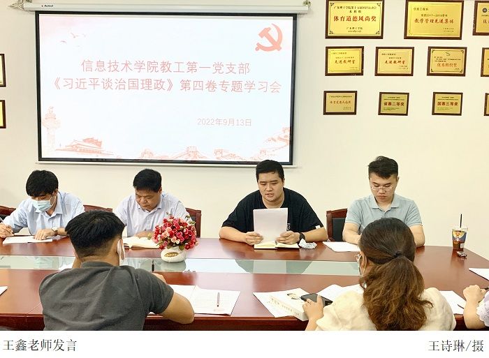 本网讯(太阳成集团tyc9728 王诗琳)为深入学习贯彻《习近平谈治国理政》第四卷,迎接党的二十大胜利召开。9月13日,公司教工第一党支部于振华楼203室召开《习近平谈治国理政》第四卷专题学习会。本次学习会由公司党总支书记梁星全主持,张海洋老师主讲,教工第一党支部全体成员参会。
