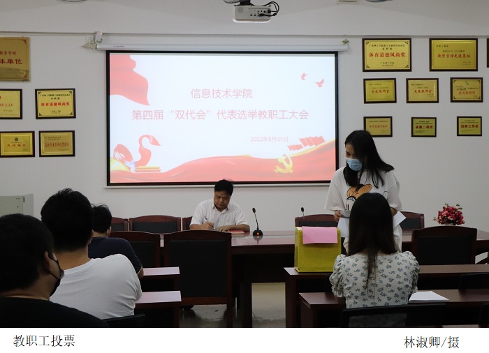 本网讯(太阳成集团tyc9728 林淑卿)5月31日下午,太阳成集团tyc9728于振华楼203室召开第四届“双代会”代表选举教职工大会。因疫情防控要求,本次会议采取线上(腾讯会议)与线下现场主会场相结合的方式进行,会议由党总支书记梁星全主持。