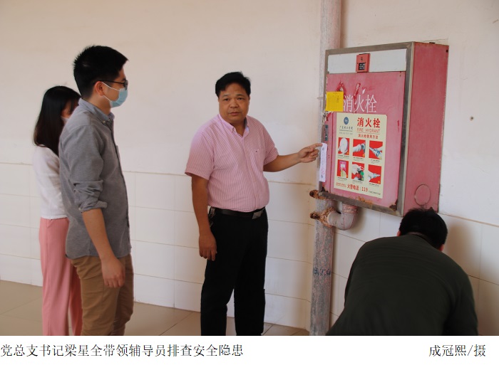 在公司党总支书记梁星全的组织指挥下,安全大检查分三个小组同时进行,分别由梁星全,党总支副书记冷云峰、学工部部长聂镇带领辅导员、员工志愿者到42栋教学楼、西区员工宿舍、东区员工宿舍进行排查,对教室、实验室、走廊、楼顶等重点场所以及各种电器设施设备、消防设施等进行了安全隐患排查,发现存在的安全隐患进行了记录,汇总后上报公司相关职能部门并提出整改意见。在对员工宿舍检查中,发现存在私拉电线插排,违规使用大功率电器等现象,辅导员马上对相关员工进行了严肃的批评教育,并要求当场整改,叮嘱员工要提高安全意识,做好安全防范措施,共同维护好校园的安全。