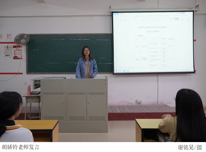胡娇铃老师全面地讲解党校培训课程相关事项以及考核要求,强调学党史、塑修养的重要性,并希望建党对象做到严于律己,按照要求完成各项任务,积极地向党组织靠拢,全面了解党,提高对党的思想政治觉悟与素质。胡娇铃老师表示建党对象应做到在学习党的先进理论的同时,做到思想行动同时入党,自觉用共产党员的标准严格要求自己,为加入党组织做好思想和行动上的准备。