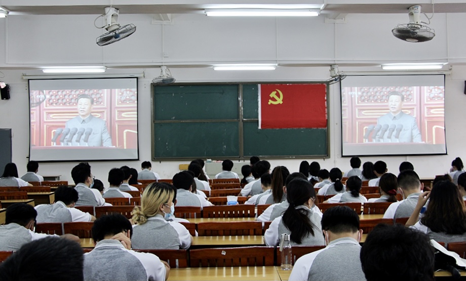 在领导老师的带领下,全体师生认真观看了庆祝中国共产党成立100周年大会,视频中习近平总书记提到,在新的征程上,我们必须坚持党的全面领导,不断完善党的领导,增强“四个意识”、坚定“四个自信”、做到“两个维护”,牢记“国之大者”,不断提高党科学执政、民主执政、依法执政水平,充分发挥党总揽全局、协调各方的领导核心作用!冷云峰副书记表示,集中收看庆祝中国共产党成立100周年大会盛况,既是一堂生动的爱国主义教育课,也是一堂思想政治教育课。我们要从百年党史中汲取前行力量,发扬红色传统、传承红色基因,始终保持革命者的大无畏奋斗精神,鼓起迈进新征程、奋进新时代的精气神。