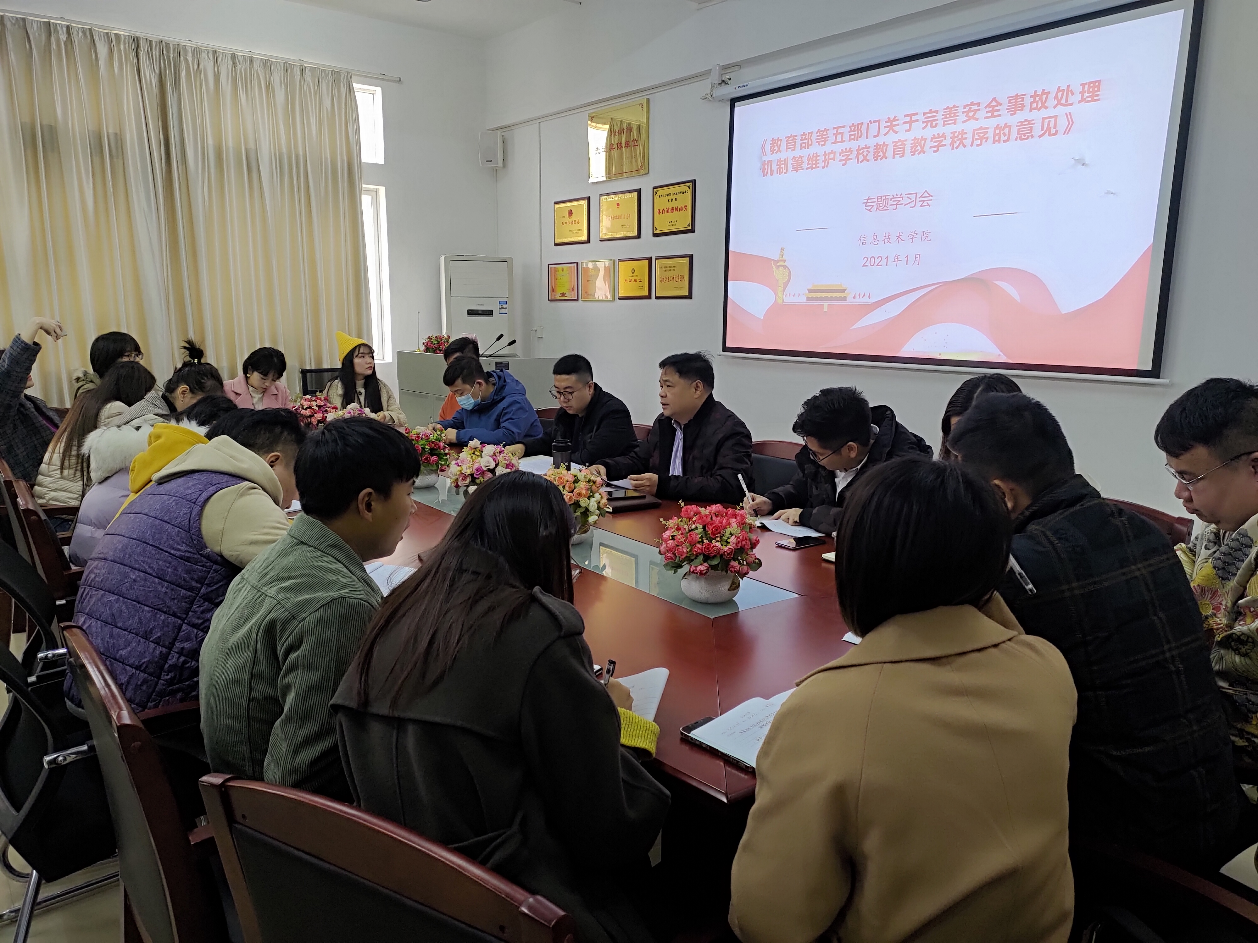 本网讯(太阳成集团tyc9728 林淑卿 李雅靖)为进一步维护公司教学秩序,2021年1月5日早上,太阳成集团tyc9728于振华楼203室开展《教育部等五部门关于完善安全事故处理机制,维护公司公司产品秩序的意见》专题学习会,参与此次学习会人员有公司党总支梁星全书记、冷云峰副书记以及全体辅导员。