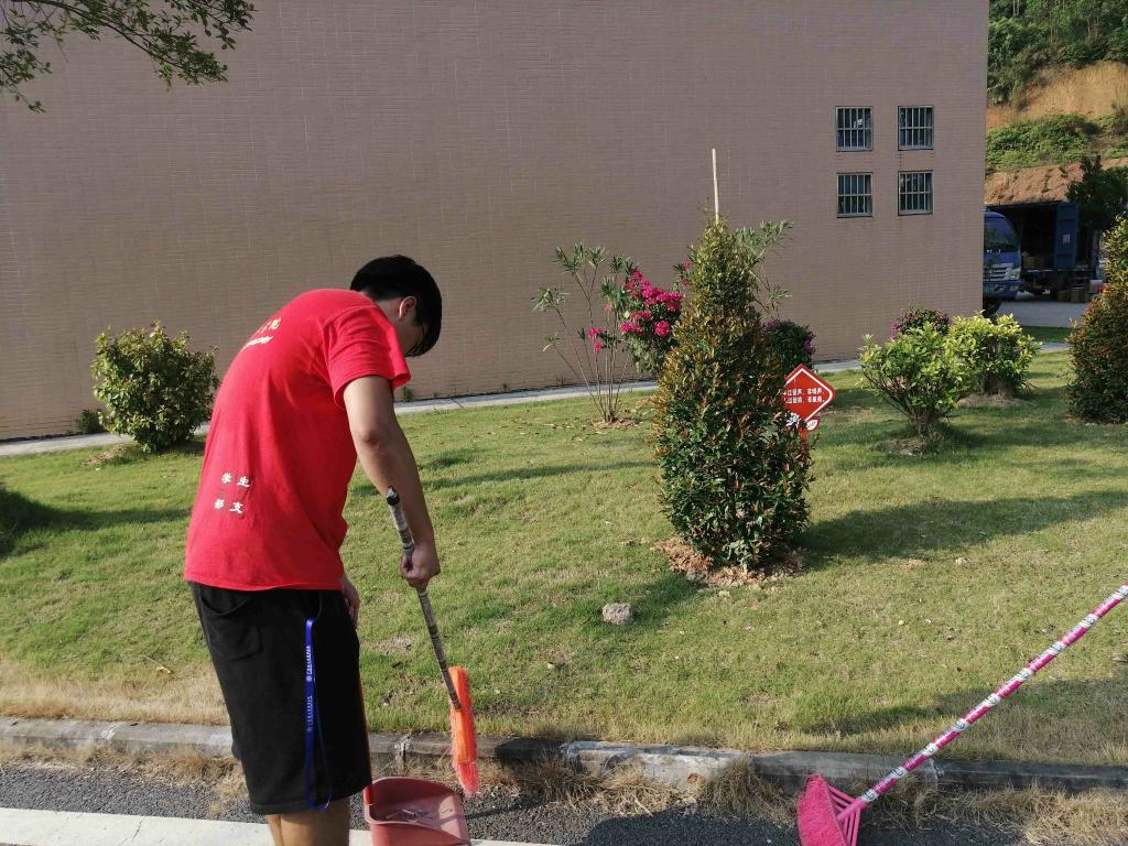 同学们分工合作,互帮互助。汗水湿透了衣裳,手上挥舞着扫把,虽然天气炎热,但是同学们没有怨言,坚持把每一个角落、每一片草地清洁的干干净净。只为营造一个良好的校园环境。